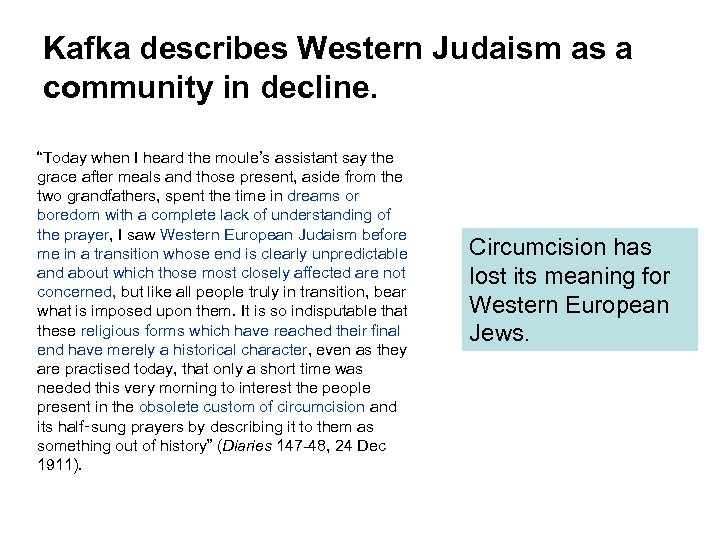 Kafka describes Western Judaism as a community in decline. “Today when I heard the moule’s assistant say the grace after meals and those present, aside from the two grandfathers, spent the time in dreams or boredom with a complete lack of understanding of the prayer, I saw Western European Judaism before me in a transition whose end is clearly unpredictable and about which those most closely affected are not concerned, but like all people truly in transition, bear what is imposed upon them. It is so indisputable that these religious forms which have reached their final end have merely a historical character, even as they are practised today, that only a short time was needed this very morning to interest the people present in the obsolete custom of circumcision and its half‑sung prayers by describing it to them as something out of history” (Diaries 147 -48, 24 Dec 1911). Circumcision has lost its meaning for Western European Jews.