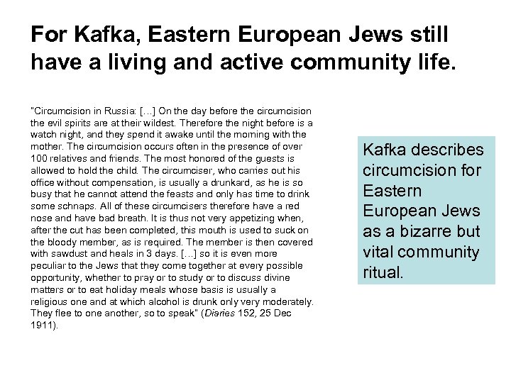 For Kafka, Eastern European Jews still have a living and active community life. “Circumcision in Russia: […] On the day before the circumcision the evil spirits are at their wildest. Therefore the night before is a watch night, and they spend it awake until the morning with the mother. The circumcision occurs often in the presence of over 100 relatives and friends. The most honored of the guests is allowed to hold the child. The circumciser, who carries out his office without compensation, is usually a drunkard, as he is so busy that he cannot attend the feasts and only has time to drink some schnaps. All of these circumcisers therefore have a red nose and have bad breath. It is thus not very appetizing when, after the cut has been completed, this mouth is used to suck on the bloody member, as is required. The member is then covered with sawdust and heals in 3 days. […] so it is even more peculiar to the Jews that they come together at every possible opportunity, whether to pray or to study or to discuss divine matters or to eat holiday meals whose basis is usually a religious one and at which alcohol is drunk only very moderately. They flee to one another, so to speak” (Diaries 152, 25 Dec 1911). Kafka describes circumcision for Eastern European Jews as a bizarre but vital community ritual.