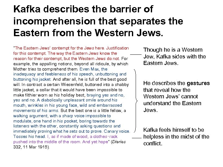 Kafka describes the barrier of incomprehension that separates the Eastern from the Western Jews. “The Eastern Jews’ contempt for the Jews here. Justification for this contempt. The way the Eastern Jews know the reason for their contempt, but the Western Jews do not. For example, the appalling notions, beyond all ridicule, by which Mother tries to comprehend them. Even Max, the inadequacy and feebleness of his speech, unbuttoning and buttoning his jacket. And after all, he is full of the best good will. In contrast a certain Wiesenfeld, buttoned into a shabby little jacket, a collar that it would have been impossible to make filthier worn as his holiday best, braying yes and no, yes and no. A diabolically unpleasant smile around his mouth, wrinkles in his young face, wild and embarrassed movements of his arms. But the best one is a little fellow, a walking argument, with a sharp voice impossible to modulate, one hand in his pocket, boring towards the listeners with the other, constantly asking questions and immediately proving what he sets out to prove. Canary voice. Tosses his head. I, as if made of wood, a clothes‑rack pushed into the middle of the room. And yet hope” (Diaries 332, 11 Mar 1915). Though he is a Western Jew, Kafka sides with the Eastern Jews. He describes the gestures that reveal how the Western Jews’ cannot understand the Eastern Jews. Kafka feels himself to be helpless in the midst of the conflict.
