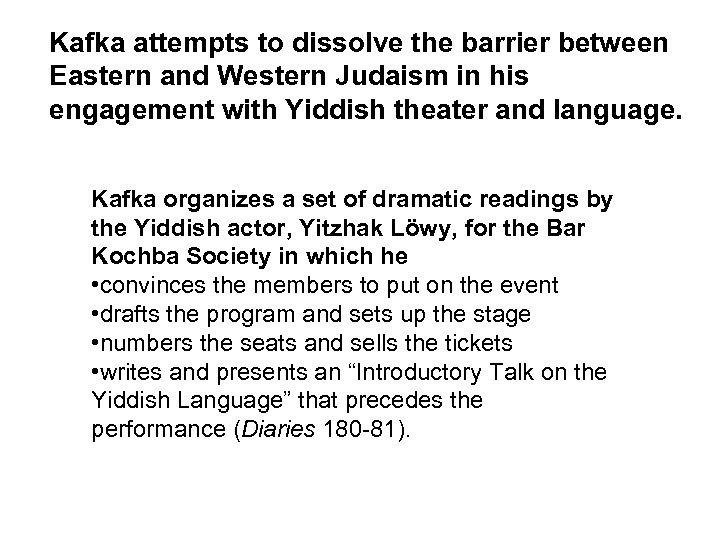 Kafka attempts to dissolve the barrier between Eastern and Western Judaism in his engagement with Yiddish theater and language. Kafka organizes a set of dramatic readings by the Yiddish actor, Yitzhak Löwy, for the Bar Kochba Society in which he • convinces the members to put on the event • drafts the program and sets up the stage • numbers the seats and sells the tickets • writes and presents an “Introductory Talk on the Yiddish Language” that precedes the performance (Diaries 180 -81).