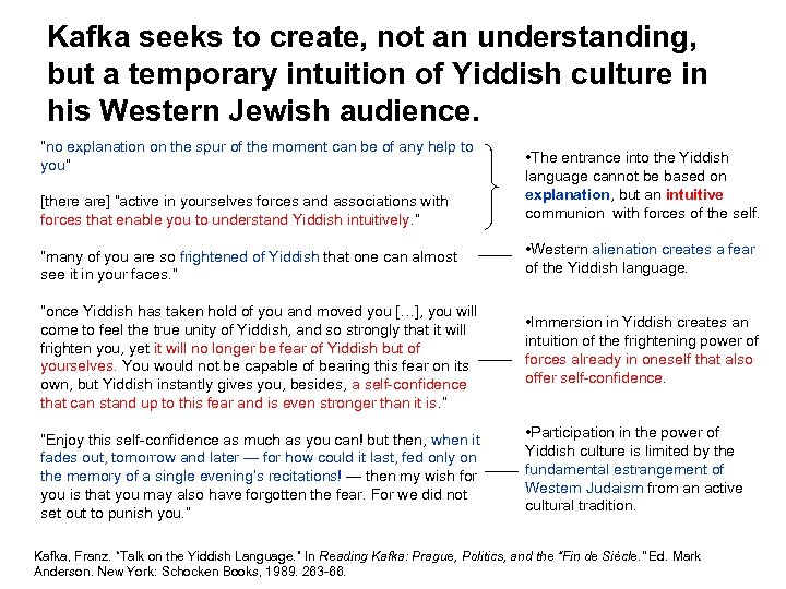 Kafka seeks to create, not an understanding, but a temporary intuition of Yiddish culture in his Western Jewish audience. “no explanation on the spur of the moment can be of any help to you” [there are] “active in yourselves forces and associations with forces that enable you to understand Yiddish intuitively. ” • The entrance into the Yiddish language cannot be based on explanation, but an intuitive communion with forces of the self. “many of you are so frightened of Yiddish that one can almost see it in your faces. ” • Western alienation creates a fear of the Yiddish language. “once Yiddish has taken hold of you and moved you […], you will come to feel the true unity of Yiddish, and so strongly that it will frighten you, yet it will no longer be fear of Yiddish but of yourselves. You would not be capable of bearing this fear on its own, but Yiddish instantly gives you, besides, a self-confidence that can stand up to this fear and is even stronger than it is. ” • Immersion in Yiddish creates an intuition of the frightening power of forces already in oneself that also offer self-confidence. “Enjoy this self-confidence as much as you can! but then, when it fades out, tomorrow and later — for how could it last, fed only on the memory of a single evening’s recitations! — then my wish for you is that you may also have forgotten the fear. For we did not set out to punish you. ” • Participation in the power of Yiddish culture is limited by the fundamental estrangement of Western Judaism from an active cultural tradition. Kafka, Franz. “Talk on the Yiddish Language. ” In Reading Kafka: Prague, Politics, and the “Fin de Siècle. ” Ed. Mark Anderson. New York: Schocken Books, 1989. 263 -66.