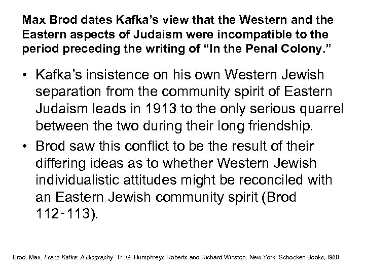 Max Brod dates Kafka’s view that the Western and the Eastern aspects of Judaism were incompatible to the period preceding the writing of “In the Penal Colony. ” • Kafka’s insistence on his own Western Jewish separation from the community spirit of Eastern Judaism leads in 1913 to the only serious quarrel between the two during their long friendship. • Brod saw this conflict to be the result of their differing ideas as to whether Western Jewish individualistic attitudes might be reconciled with an Eastern Jewish community spirit (Brod 112‑ 113). Brod, Max. Franz Kafka: A Biography. Tr. G. Humphreys Roberts and Richard Winston. New York: Schocken Books, l 960.