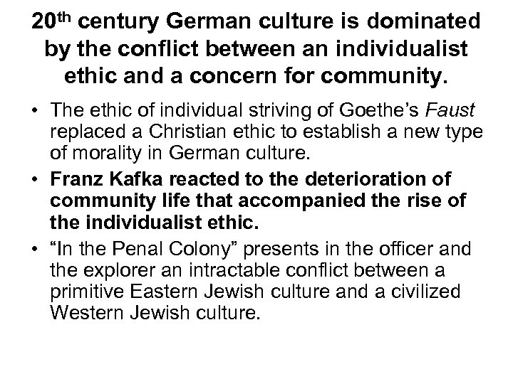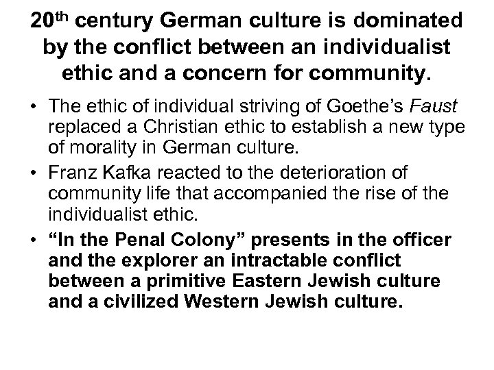 20 th century German culture is dominated by the conflict between an individualist ethic and a concern for community. • The ethic of individual striving of Goethe’s Faust replaced a Christian ethic to establish a new type of morality in German culture. • Franz Kafka reacted to the deterioration of community life that accompanied the rise of the individualist ethic. • “In the Penal Colony” presents in the officer and the explorer an intractable conflict between a primitive Eastern Jewish culture and a civilized Western Jewish culture.