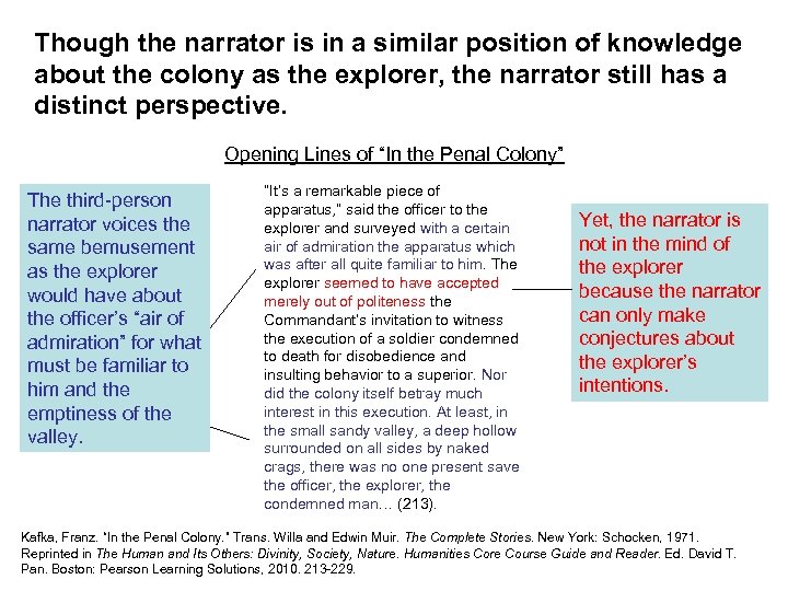 Though the narrator is in a similar position of knowledge about the colony as the explorer, the narrator still has a distinct perspective. Opening Lines of “In the Penal Colony” The third-person narrator voices the same bemusement as the explorer would have about the officer’s “air of admiration” for what must be familiar to him and the emptiness of the valley. “It’s a remarkable piece of apparatus, ” said the officer to the explorer and surveyed with a certain air of admiration the apparatus which was after all quite familiar to him. The explorer seemed to have accepted merely out of politeness the Commandant’s invitation to witness the execution of a soldier condemned to death for disobedience and insulting behavior to a superior. Nor did the colony itself betray much interest in this execution. At least, in the small sandy valley, a deep hollow surrounded on all sides by naked crags, there was no one present save the officer, the explorer, the condemned man… (213). Yet, the narrator is not in the mind of the explorer because the narrator can only make conjectures about the explorer’s intentions. Kafka, Franz. “In the Penal Colony. ” Trans. Willa and Edwin Muir. The Complete Stories. New York: Schocken, 1971. Reprinted in The Human and Its Others: Divinity, Society, Nature. Humanities Core Course Guide and Reader. Ed. David T. Pan. Boston: Pearson Learning Solutions, 2010. 213 -229.