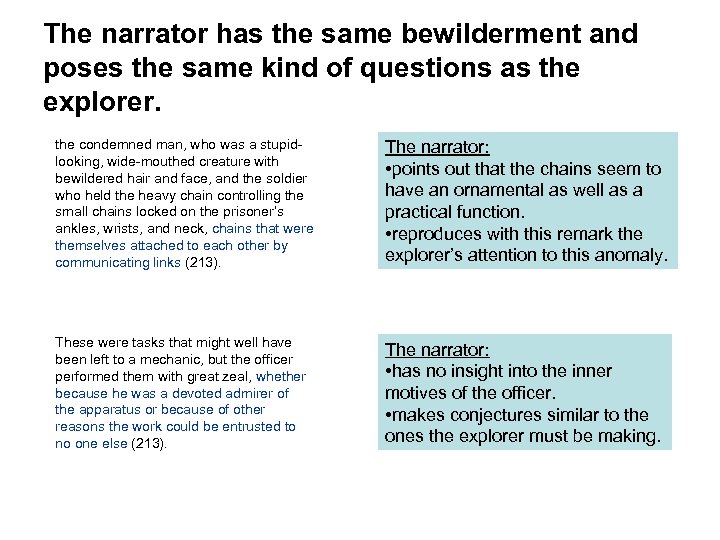 The narrator has the same bewilderment and poses the same kind of questions as the explorer. the condemned man, who was a stupidlooking, wide-mouthed creature with bewildered hair and face, and the soldier who held the heavy chain controlling the small chains locked on the prisoner’s ankles, wrists, and neck, chains that were themselves attached to each other by communicating links (213). The narrator: • points out that the chains seem to have an ornamental as well as a practical function. • reproduces with this remark the explorer’s attention to this anomaly. These were tasks that might well have been left to a mechanic, but the officer performed them with great zeal, whether because he was a devoted admirer of the apparatus or because of other reasons the work could be entrusted to no one else (213). The narrator: • has no insight into the inner motives of the officer. • makes conjectures similar to the ones the explorer must be making.