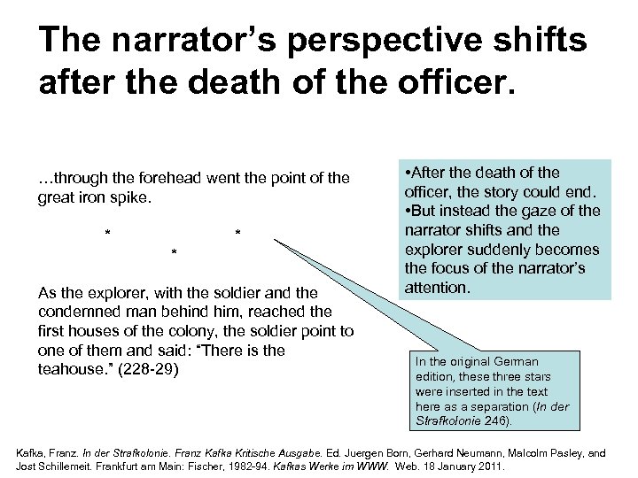 The narrator’s perspective shifts after the death of the officer. …through the forehead went the point of the great iron spike. * * * As the explorer, with the soldier and the condemned man behind him, reached the first houses of the colony, the soldier point to one of them and said: “There is the teahouse. ” (228 -29) • After the death of the officer, the story could end. • But instead the gaze of the narrator shifts and the explorer suddenly becomes the focus of the narrator’s attention. In the original German edition, these three stars were inserted in the text here as a separation (In der Strafkolonie 246). Kafka, Franz. In der Strafkolonie. Franz Kafka Kritische Ausgabe. Ed. Juergen Born, Gerhard Neumann, Malcolm Pasley, and Jost Schillemeit. Frankfurt am Main: Fischer, 1982 -94. Kafkas Werke im WWW. Web. 18 January 2011.