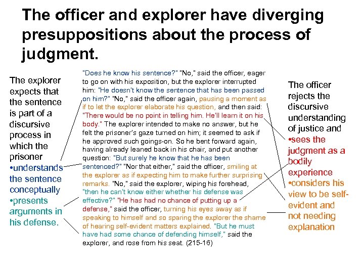 The officer and explorer have diverging presuppositions about the process of judgment. The explorer expects that the sentence is part of a discursive process in which the prisoner • understands the sentence conceptually • presents arguments in his defense. “Does he know his sentence? ” “No, ” said the officer, eager to go on with his exposition, but the explorer interrupted him: “He doesn’t know the sentence that has been passed on him? ” “No, ” said the officer again, pausing a moment as if to let the explorer elaborate his question, and then said: “There would be no point in telling him. He’ll learn it on his body. ” The explorer intended to make no answer, but he felt the prisoner’s gaze turned on him; it seemed to ask if he approved such goings-on. So he bent forward again, having already leaned back in his chair, and put another question: “But surely he know that he has been sentenced? ” “Nor that either, ” said the officer, smiling at the explorer as if expecting him to make further surprising remarks. “No, ” said the explorer, wiping his forehead, “then he can’t know either whether his defense was effective? ” “He has had no chance of putting up a defense, ” said the officer, turning his eyes away as if speaking to himself and so sparing the explorer the shame of hearing self-evident matters explained. “But he must have had some chance of defending himself, ” said the explorer, and rose from his seat. (215 -16) The officer rejects the discursive understanding of justice and • sees the judgment as a bodily experience • considers his view to be selfevident and not needing explanation