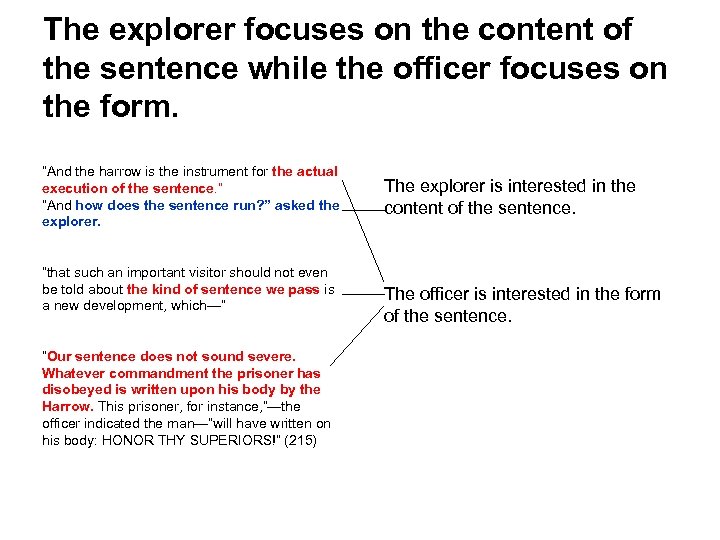 The explorer focuses on the content of the sentence while the officer focuses on the form. “And the harrow is the instrument for the actual execution of the sentence. ” “And how does the sentence run? ” asked the explorer. “that such an important visitor should not even be told about the kind of sentence we pass is a new development, which—” “Our sentence does not sound severe. Whatever commandment the prisoner has disobeyed is written upon his body by the Harrow. This prisoner, for instance, ”—the officer indicated the man—”will have written on his body: HONOR THY SUPERIORS!” (215) The explorer is interested in the content of the sentence. The officer is interested in the form of the sentence.