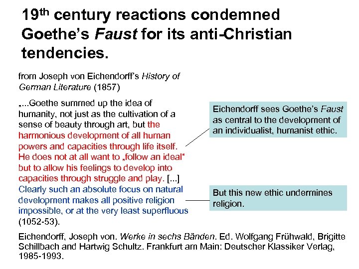 19 th century reactions condemned Goethe’s Faust for its anti-Christian tendencies. from Joseph von Eichendorff’s History of German Literature (1857) „. . . Goethe summed up the idea of humanity, not just as the cultivation of a sense of beauty through art, but the harmonious development of all human powers and capacities through life itself. He does not at all want to „follow an ideal“ but to allow his feelings to develop into capacities through struggle and play. [. . . ] Clearly such an absolute focus on natural development makes all positive religion impossible, or at the very least superfluous (1052 -53). Eichendorff sees Goethe’s Faust as central to the development of an individualist, humanist ethic. But this new ethic undermines religion. Eichendorff, Joseph von. Werke in sechs Bänden. Ed. Wolfgang Frühwald, Brigitte Schillbach and Hartwig Schultz. Frankfurt am Main: Deutscher Klassiker Verlag, 1985 -1993.