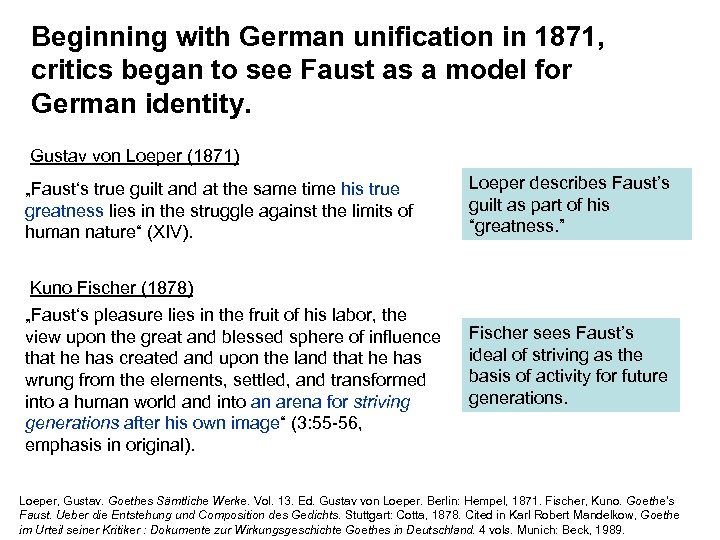 Beginning with German unification in 1871, critics began to see Faust as a model for German identity. Gustav von Loeper (1871) „Faust‘s true guilt and at the same time his true greatness lies in the struggle against the limits of human nature“ (XIV). Loeper describes Faust’s guilt as part of his “greatness. ” Kuno Fischer (1878) „Faust‘s pleasure lies in the fruit of his labor, the view upon the great and blessed sphere of influence that he has created and upon the land that he has wrung from the elements, settled, and transformed into a human world and into an arena for striving generations after his own image“ (3: 55 -56, emphasis in original). Fischer sees Faust’s ideal of striving as the basis of activity for future generations. Loeper, Gustav. Goethes Sämtliche Werke. Vol. 13. Ed. Gustav von Loeper. Berlin: Hempel, 1871. Fischer, Kuno. Goethe’s Faust. Ueber die Entstehung und Composition des Gedichts. Stuttgart: Cotta, 1878. Cited in Karl Robert Mandelkow, Goethe im Urteil seiner Kritiker : Dokumente zur Wirkungsgeschichte Goethes in Deutschland. 4 vols. Munich: Beck, 1989.