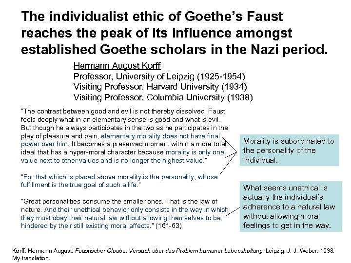 The individualist ethic of Goethe’s Faust reaches the peak of its influence amongst established Goethe scholars in the Nazi period. Hermann August Korff Professor, University of Leipzig (1925 -1954) Visiting Professor, Harvard University (1934) Visiting Professor, Columbia University (1938) “The contrast between good and evil is not thereby dissolved. Faust feels deeply what in an elementary sense is good and what is evil. But though he always participates in the two as he participates in the play of pleasure and pain, elementary morality does not have final power over him. It becomes a preserved moment within a more total ideal that has a hyper-moral character because morality is only one value next to other values and is no longer the highest value. ” “For that which is placed above morality is the personality, whose fulfillment is the true goal of such a life. ” “Great personalities consume the smaller ones. That is the law of nature. And their unethical behavior only consists in the way in which they must obey their natural law without allowing themselves to be hindered by their still existing moral affects. ” (161 -63) Morality is subordinated to the personality of the individual. What seems unethical is actually the individual’s adherence to a natural law without allowing moral feelings to get in the way. Korff, Hermann August. Faustischer Glaube: Versuch über das Problem humaner Lebenshaltung. Leipzig: J. J. Weber, 1938. My translation.