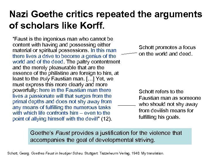 Nazi Goethe critics repeated the arguments of scholars like Korff. “Faust is the ingenious man who cannot be content with having and possessing either material or spiritual possessions. In this man there lives a drive to become a genius of the world and of the deed. The paltry contentment and the merely pleasurable that are the essence of the philistine are foreign to him, at least to the truly Faustian man. […] Yet, we must express this more clearly and more powerfully: here in the Faustian man there lives a passionate will that surges from the primal depths and does not shy away from any means of fulfilling the numerous tasks with which life confronts him – even to the point of allying himself with the devil!” (12). Schott promotes a focus on the world and deed. Schott refers to the Faustian man as someone who should not shy away from devilish means for fulfilling his goals. Goethe’s Faust provides a justification for the violence that accompanies the goal of developmental striving. Schott, Georg. Goethes Faust in heutiger Schau. Stuttgart: Tazzelwurm Verlag, 1940. My translation.