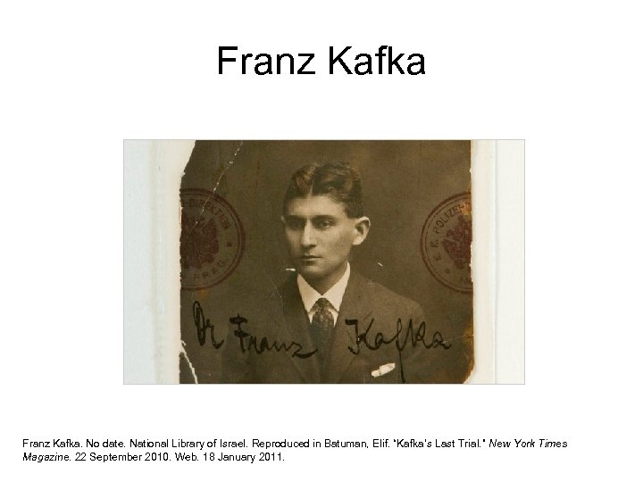 Franz Kafka. No date. National Library of Israel. Reproduced in Batuman, Elif. “Kafka’s Last Trial. ” New York Times Magazine. 22 September 2010. Web. 18 January 2011.