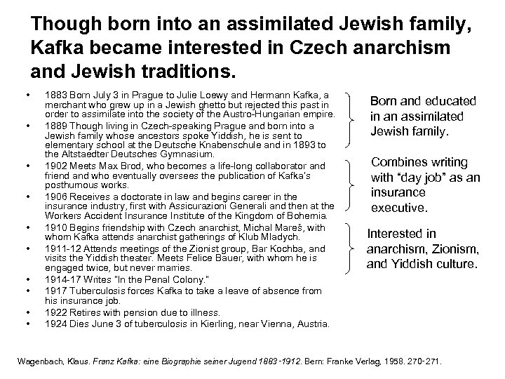 Though born into an assimilated Jewish family, Kafka became interested in Czech anarchism and Jewish traditions. • • • 1883 Born July 3 in Prague to Julie Loewy and Hermann Kafka, a merchant who grew up in a Jewish ghetto but rejected this past in order to assimilate into the society of the Austro-Hungarian empire. 1889 Though living in Czech-speaking Prague and born into a Jewish family whose ancestors spoke Yiddish, he is sent to elementary school at the Deutsche Knabenschule and in 1893 to the Altstaedter Deutsches Gymnasium. 1902 Meets Max Brod, who becomes a life-long collaborator and friend and who eventually oversees the publication of Kafka’s posthumous works. 1906 Receives a doctorate in law and begins career in the insurance industry, first with Assicurazioni Generali and then at the Workers Accident Insurance Institute of the Kingdom of Bohemia. 1910 Begins friendship with Czech anarchist, Michal Mareš, with whom Kafka attends anarchist gatherings of Klub Mladych. 1911 -12 Attends meetings of the Zionist group, Bar Kochba, and visits the Yiddish theater. Meets Felice Bauer, with whom he is engaged twice, but never marries. 1914 -17 Writes “In the Penal Colony. ” 1917 Tuberculosis forces Kafka to take a leave of absence from his insurance job. 1922 Retires with pension due to illness. 1924 Dies June 3 of tuberculosis in Kierling, near Vienna, Austria. Born and educated in an assimilated Jewish family. Combines writing with “day job” as an insurance executive. Interested in anarchism, Zionism, and Yiddish culture. Wagenbach, Klaus. Franz Kafka: eine Biographie seiner Jugend 1883‑ 1912. Bern: Franke Verlag, 1958. 270‑ 271.
