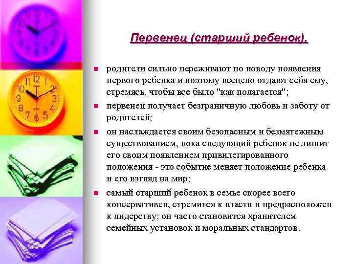 Первенец (старший ребенок). n n родители сильно переживают по поводу появления первого ребенка и поэтому всецело отдают себя ему, стремясь, чтобы все было "как полагается"; первенец получает безграничную любовь и заботу от родителей; он наслаждается своим безопасным и безмятежным существованием, пока следующий ребенок не лишит его своим появлением привилегированного положения - это событие меняет положение ребенка и его взгляд на мир; самый старший ребенок в семье скорее всего консервативен, стремится к власти и предрасположен к лидерству; он часто становится хранителем семейных установок и моральных стандартов.