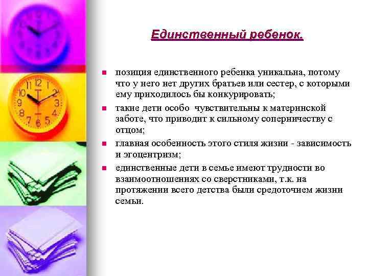 Единственный ребенок. n n позиция единственного ребенка уникальна, потому что у него нет других братьев или сестер, с которыми ему приходилось бы конкурировать; такие дети особо чувствительны к материнской заботе, что приводит к сильному соперничеству с отцом; главная особенность этого стиля жизни - зависимость и эгоцентризм; единственные дети в семье имеют трудности во взаимоотношениях со сверстниками, т. к. на протяжении всего детства были средоточием жизни семьи.