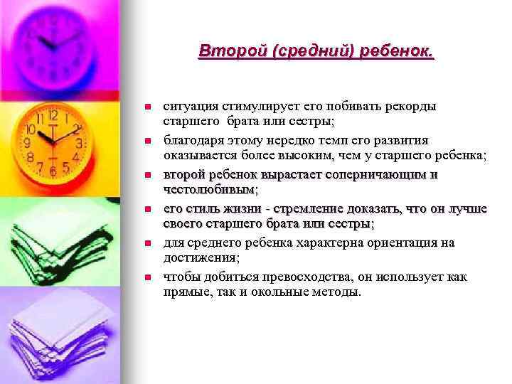 Второй (средний) ребенок. n n n ситуация стимулирует его побивать рекорды старшего брата или сестры; благодаря этому нередко темп его развития оказывается более высоким, чем у старшего ребенка; второй ребенок вырастает соперничающим и честолюбивым; его стиль жизни - стремление доказать, что он лучше своего старшего брата или сестры; для среднего ребенка характерна ориентация на достижения; чтобы добиться превосходства, он использует как прямые, так и окольные методы.