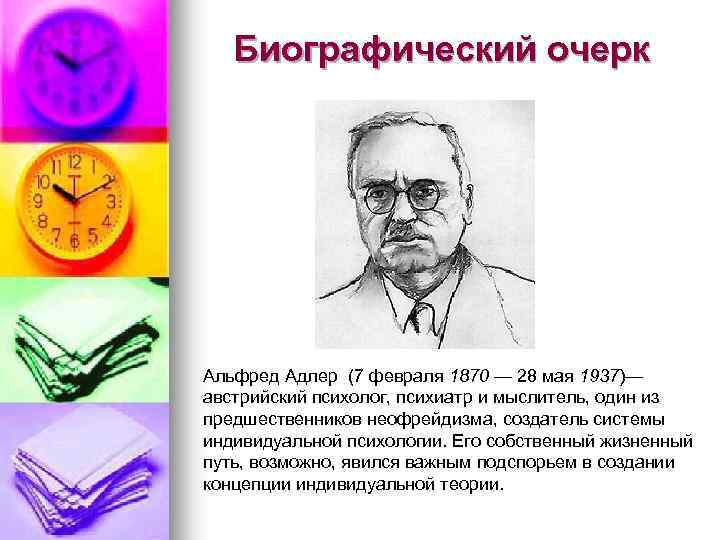 Биографический очерк Альфред Адлер (7 февраля 1870 — 28 мая 1937)— австрийский психолог, психиатр и мыслитель, один из предшественников неофрейдизма, создатель системы индивидуальной психологии. Его собственный жизненный путь, возможно, явился важным подспорьем в создании концепции индивидуальной теории.