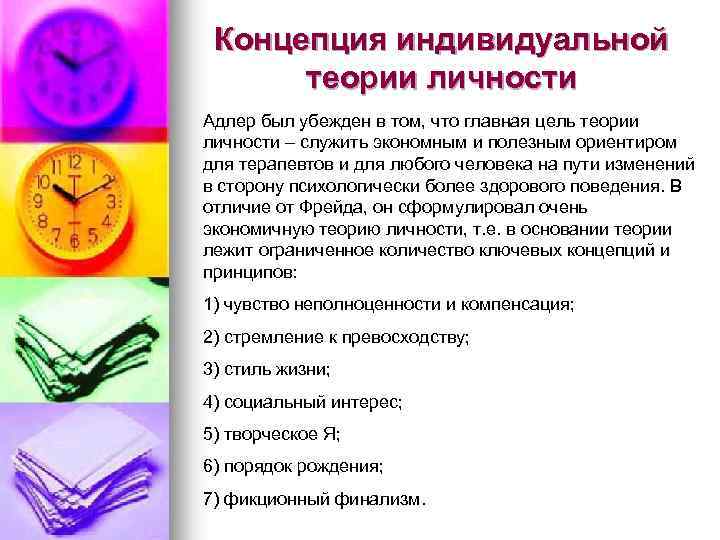 Концепция индивидуальной теории личности Адлер был убежден в том, что главная цель теории личности – служить экономным и полезным ориентиром для терапевтов и для любого человека на пути изменений в сторону психологически более здорового поведения. В отличие от Фрейда, он сформулировал очень экономичную теорию личности, т. е. в основании теории лежит ограниченное количество ключевых концепций и принципов: 1) чувство неполноценности и компенсация; 2) стремление к превосходству; 3) стиль жизни; 4) социальный интерес; 5) творческое Я; 6) порядок рождения; 7) фикционный финализм.