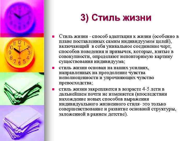 3) Стиль жизни n n n Стиль жизни - способ адаптации к жизни (особенно в плане поставленных самим индивидуумом целей), включающий в себя уникальное соединение черт, способов поведения и привычек, которые, взятые в совокупности, определяют неповторимую картину существования индивидуума; стиль жизни основан на наших усилиях, направленных на преодоление чувства неполноценности и упрочняющих чувство превосходства; стиль жизни закрепляется в возрасте 4 -5 лети в дальнейшем почти не изменяется (впоследствии нахождение новых способов выражения индивидуального жизненного стиля- это только совершенствование и развитие основной структуры, заложенной в раннем детстве).