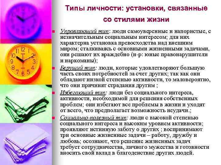 Типы личности: установки, связанные со стилями жизни n n Управляющий тип: люди самоуверенные и напористые, с незначительным социальным интересом; для них характерна установка превосходства над внешним миром; сталкиваясь с основными жизненными задачами, они решают их враждебно (н-р: юные правонарушители и наркоманы); Берущий тип: люди, которые удовлетворяют большую часть своих потребностей за счет других; так как они обладают низкой степенью активности, то маловероятно, что они причинят страдания другим ; Избегающий тип: люди без социального интереса, активности, необходимой для решения собственных проблем; они избегают все проблемы в жизни и уходят от всего, что предполагает возможность неудачи. ; Социально-полезный тип: люди с высокой степенью социального интереса и высоким уровнем активности; проявляют истинную заботу о других ; воспринимают три основные жизненные задачи – работу, дружбу и любовь; осознают, что решение жизненных задач требует сотрудничества, личного мужества и готовности вносить свой вклад в благоденствие других людей.