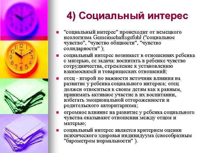4) Социальный интерес n n n "социальный интерес" происходит от немецкого неологизма Gemeinschaftsgefuhl ("социальное чувство", "чувство общности", "чувство солидарности" ); социальный интерес возникает в отношениях ребенка с матерью, ее задача: воспитать в ребенке чувство сотрудничества, стремление к установлению взаимосвязей и товарищеских отношений; отец - второй по важности источник влияния на развитие у ребенка социального интереса; отец должен относиться к своим детям как к равным, принимать активное участие в их воспитании, избегать эмоциональной отгороженности и родительского авторитаризма; огромное влияние на развитие у ребенка социального чувства оказывают отношения между отцом и матерью; социальный интерес является критерием оценки психического здоровья индивидуума (своеобразным "барометром нормальности" ).