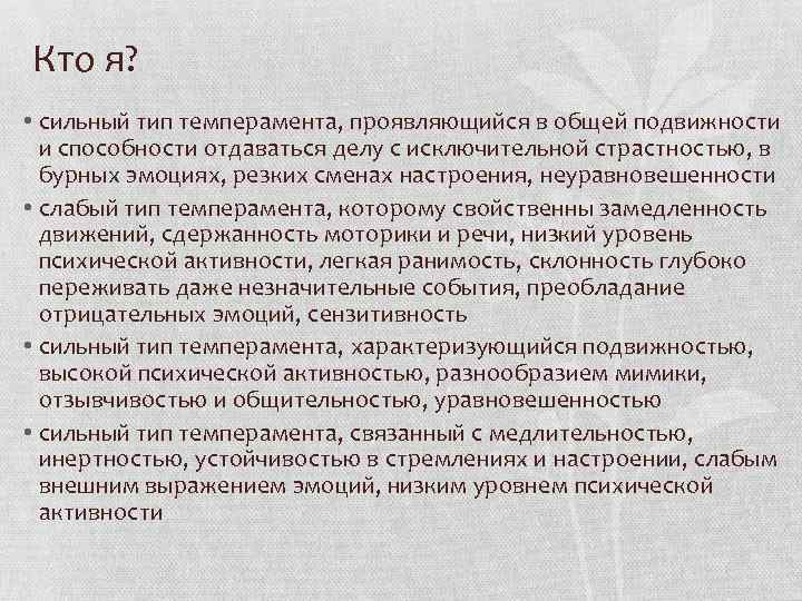 Кто я? • сильный тип темперамента, проявляющийся в общей подвижности и способности отдаваться делу с исключительной страстностью, в бурных эмоциях, резких сменах настроения, неуравновешенности • слабый тип темперамента, которому свойственны замедленность движений, сдержанность моторики и речи, низкий уровень психической активности, легкая ранимость, склонность глубоко переживать даже незначительные события, преобладание отрицательных эмоций, сензитивность • сильный тип темперамента, характеризующийся подвижностью, высокой психической активностью, разнообразием мимики, отзывчивостью и общительностью, уравновешенностью • сильный тип темперамента, связанный с медлительностью, инертностью, устойчивостью в стремлениях и настроении, слабым внешним выражением эмоций, низким уровнем психической активности