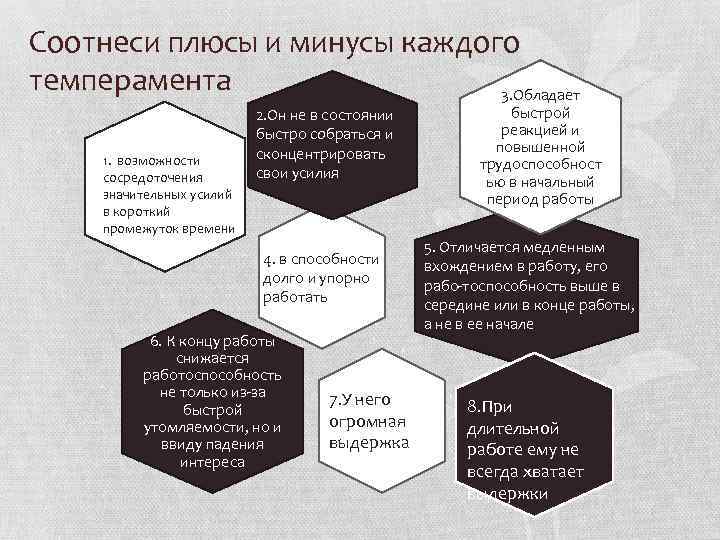Соотнеси плюсы и минусы каждого темперамента 3. Обладает 1. возможности сосредоточения значительных усилий в короткий промежуток времени 2. Он не в состоянии быстро собраться и сконцентрировать свои усилия 4. в способности долго и упорно работать 6. К концу работы снижается работоспособность не только из за быстрой утомляемости, но и ввиду падения интереса 7. У него огромная выдержка быстрой реакцией и повышенной трудоспособност ью в начальный период работы 5. Отличается медленным вхождением в работу, его рабо тоспособность выше в середине или в конце работы, а не в ее начале 8. При длительной работе ему не всегда хватает выдержки