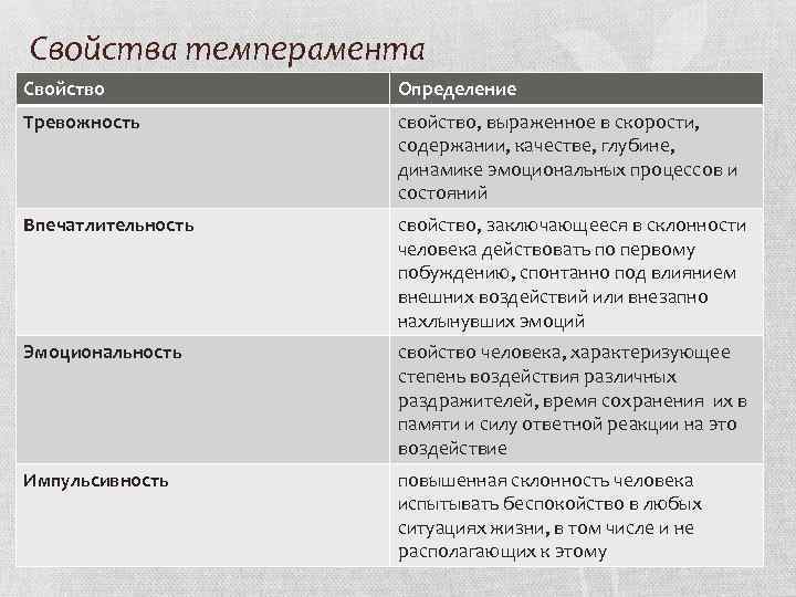 Свойства темперамента Свойство Определение Тревожность свойство, выраженное в скорости, содержании, качестве, глубине, динамике эмоциональных процессов и состояний Впечатлительность свойство, заключающееся в склонности человека действовать по первому побуждению, спонтанно под влиянием внешних воздействий или внезапно нахлынувших эмоций Эмоциональность свойство человека, характеризующее степень воздействия различных раздражителей, время сохранения их в памяти и силу ответной реакции на это воздействие Импульсивность повышенная склонность человека испытывать беспокойство в любых ситуациях жизни, в том числе и не располагающих к этому