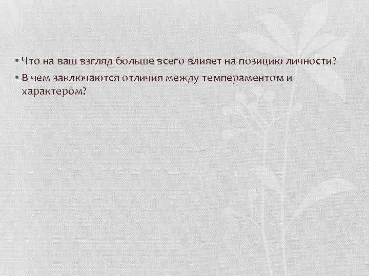 • Что на ваш взгляд больше всего влияет на позицию личности? • В чем заключаются отличия между темпераментом и характером?