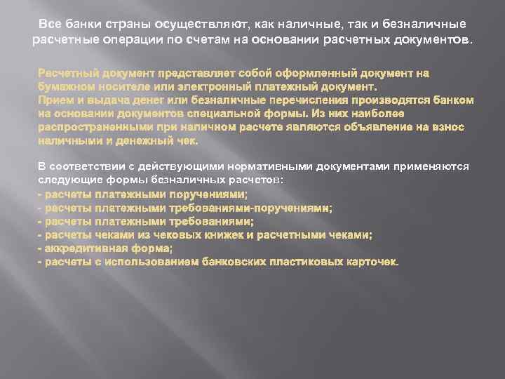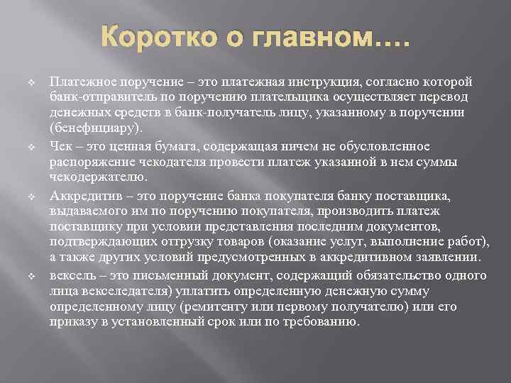 Коротко о главном…. v v Платежное поручение – это платежная инструкция, согласно которой банк-отправитель по поручению плательщика осуществляет перевод денежных средств в банк-получатель лицу, указанному в поручении (бенефициару). Чек – это ценная бумага, содержащая ничем не обусловленное распоряжение чекодателя провести платеж указанной в нем суммы чекодержателю. Аккредитив – это поручение банка покупателя банку поставщика, выдаваемого им по поручению покупателя, производить платеж поставщику при условии представления последним документов, подтверждающих отгрузку товаров (оказание услуг, выполнение работ), а также других условий предусмотренных в аккредитивном заявлении. вексель – это письменный документ, содержащий обязательство одного лица векселедателя) уплатить определенную денежную сумму определенному лицу (ремитенту или первому получателю) или его приказу в установленный срок или по требованию.