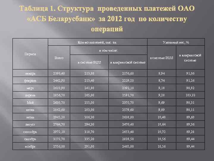 Кол-во платежей, тыс. ед. Период Удельный вес, % в том числе: в системе BISS Всего в системе BISS в клиринговой системе январь 2390, 40 213, 80 2176, 60 8, 94 91, 06 февраль 2442, 90 213, 40 2229, 50 8, 74 91, 26 март 2633, 90 241, 80 2392, 10 9, 18 90, 82 апрель 2856, 70 265, 00 2591, 70 9, 28 103, 33 Май 2630, 70 255, 00 2375, 70 9, 69 90, 31 июнь 2862, 60 283, 00 2579, 60 9, 89 90, 11 июль 2945, 20 306, 30 2638, 80 10, 40 89, 60 август 2764, 70 294, 30 2470, 40 10, 64 89, 36 сентябрь 2972, 10 318, 70 2653, 40 10, 72 89, 28 октябрь 3173, 70 335, 20 2838, 50 10, 56 89, 44 ноябрь 2756, 00 291, 00 2465, 00 10, 56 89, 44