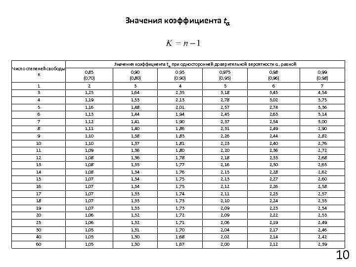 Значения коэффициента t Число степеней свободы К 1 3 4 5 6 7 8 9 10 11 12 13 14 15 16 17 18 19 20 25 30 40 60 Значения коэффициента t при односторонней доверительной вероятности , равной 0, 85 (0, 70) 0, 90 (0, 80) 0, 95 (0, 90) 0, 975 (0, 95) 0, 98 (0, 96) 0, 99 (0, 98) 2 1, 25 1, 19 1, 16 1, 13 1, 12 1, 11 1, 10 1, 09 1, 08 1, 07 1, 07 1, 06 1, 05 3 1, 64 1, 53 1, 48 1, 44 1, 41 1, 40 1, 38 1, 37 1, 36 1, 35 1, 34 1, 33 1, 32 1, 31 1, 30 4 2, 35 2, 13 2, 01 1, 94 1, 90 1, 86 1, 83 1, 81 1, 80 1, 78 1, 77 1, 76 1, 75 1, 74 1, 73 1, 72 1, 71 1, 70 1, 68 1, 67 5 3, 18 2, 78 2, 57 2, 45 2, 37 2, 31 2, 26 2, 23 2, 20 2, 18 2, 16 2, 15 2, 13 2, 12 2, 11 2, 10 2, 09 2, 06 2, 04 2, 02 2, 00 6 3, 45 3, 02 2, 74 2, 63 2, 54 2, 49 2, 44 2, 40 2, 36 2, 33 2, 30 2, 28 2, 27 2, 26 2, 25 2, 24 2, 23 2, 22 2, 19 2, 17 2, 14 2, 12 7 4, 54 3, 75 3, 36 3, 14 3, 00 2, 90 2, 82 2, 76 2, 72 2, 68 2, 65 2, 62 2, 60 2, 58 2, 57 2, 55 2, 54 2, 53 2, 49 2, 46 2, 42 2, 39 10