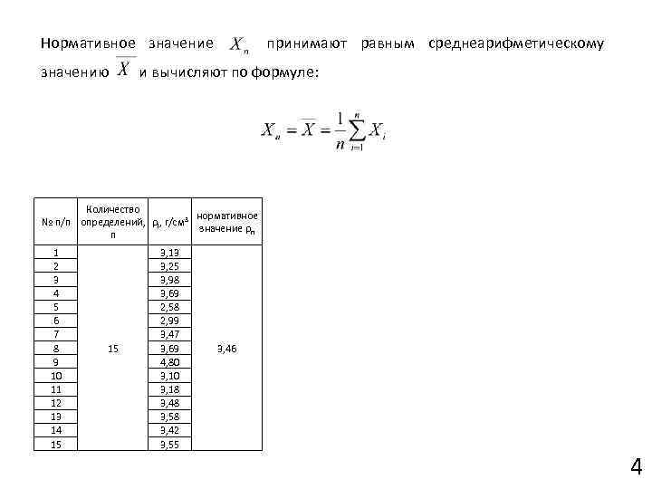 Нормативное значение принимают равным среднеарифметическому значению и вычисляют по формуле: Количество нормативное № п/п определений, ρi, г/см 3 значение ρn n 1 2 3 4 5 6 7 8 9 10 11 12 13 14 15 15 3, 13 3, 25 3, 98 3, 69 2, 58 2, 99 3, 47 3, 69 4, 80 3, 18 3, 48 3, 58 3, 42 3, 55 3, 46 4