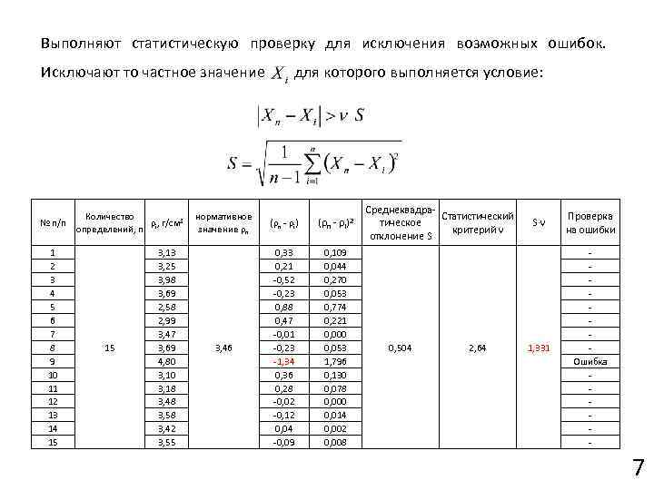 Выполняют статистическую проверку для исключения возможных ошибок. Исключают то частное значение для которого выполняется условие: № п/п 1 2 3 4 5 6 7 8 9 10 11 12 13 14 15 Количество ρ , г/см 3 определений, n i 15 3, 13 3, 25 3, 98 3, 69 2, 58 2, 99 3, 47 3, 69 4, 80 3, 18 3, 48 3, 58 3, 42 3, 55 нормативное значение ρn (ρn - ρi)2 Среднеквадратическое отклонение S 3, 46 0, 33 0, 21 -0, 52 -0, 23 0, 88 0, 47 -0, 01 -0, 23 -1, 34 0, 36 0, 28 -0, 02 -0, 12 0, 04 -0, 09 0, 109 0, 044 0, 270 0, 053 0, 774 0, 221 0, 000 0, 053 1, 796 0, 130 0, 078 0, 000 0, 014 0, 002 0, 008 0, 504 Σ(ρn - ρi)2 3, 5527 5