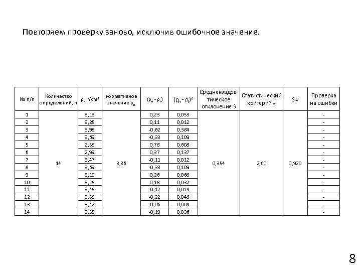 Выполняют статистическую проверку для исключения возможных ошибок. Исключают то частное значение для которого выполняется условие: Количество № п/п ρ , г/см 3 определений, n i 1 2 3 4 5 6 7 8 9 10 11 12 13 14 15 15 3, 13 3, 25 3, 98 3, 69 2, 58 2, 99 3, 47 3, 69 4, 80 3, 18 3, 48 3, 58 3, 42 3, 55 нормативное значение ρn (ρn - ρi)2 3, 46 0, 33 0, 21 -0, 52 -0, 23 0, 88 0, 47 -0, 01 -0, 23 -1, 34 0, 36 0, 28 -0, 02 -0, 12 0, 04 -0, 09 0, 109 0, 044 0, 270 0, 053 0, 774 0, 221 0, 000 0, 053 1, 796 0, 130 0, 078 0, 000 0, 014 0, 002 0, 008 Среднеквадра. Статистический тическое критерий ν отклонение S 0, 504 2, 64 S·ν Проверка на ошибки 1, 331 Ошибка - 7