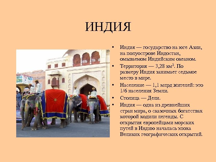 ИНДИЯ • • • Индия — государство на юге Азии, на полуострове Индостан, омываемом Индийским океаном. Территория — 3, 28 км 2. По размеру Индия занимает седьмое место в мире. Население — 1, 1 млрд жителей: это 1/6 населения Земли. Столица — Дели. Индия — одна из древнейших стран мира, о сказочных богатствах которой ходили легенды. С открытия европейцами морских путей в Индию началась эпоха Великих географических открытий.