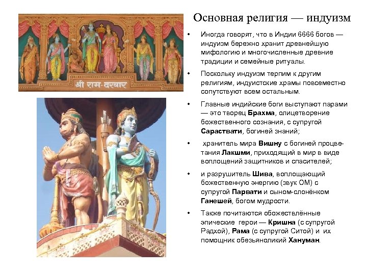 Основная религия — индуизм • Иногда говорят, что в Индии 6666 богов — индуизм бережно хранит древнейшую мифологию и многочисленные древние традиции и семейные ритуалы. • Поскольку индуизм терпим к другим религиям, индуистские храмы повсеместно сопутствуют всем остальным. • Главные индийские боги выступают парами — это творец Брахма, олицетворение божественного сознания, с супругой Сараствати, богиней знаний; • хранитель мира Вишну с богиней процветания Лакшми, приходящий в мир в виде воплощений защитников и спасителей; • и разрушитель Шива, воплощающий божественную энергию (звук ОМ) с супругой Парвати и сыном-слонёнком Ганешей, богом мудрости. • Также почитаются обожествлённые эпические герои — Кришна (с супругой Радхой), Рама (с супругой Ситой) и их помощник обезьяноликий Хануман.