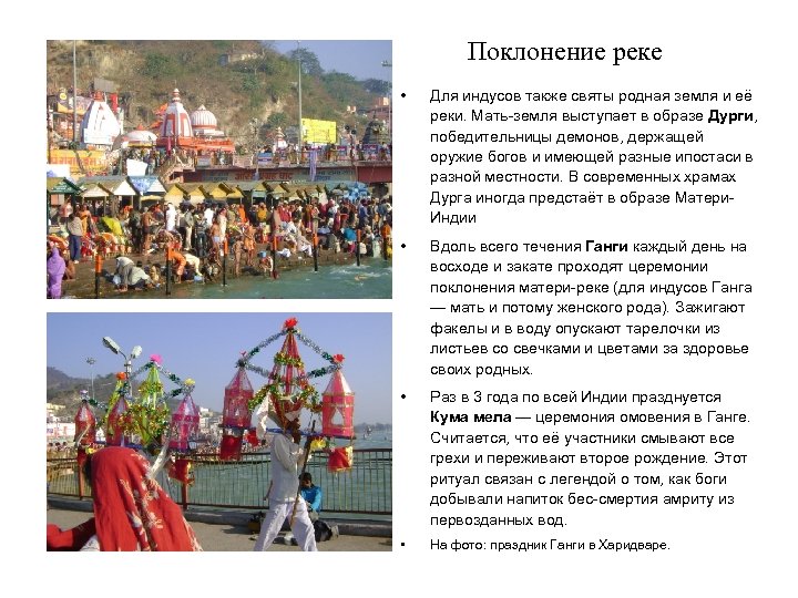 Поклонение реке • Для индусов также святы родная земля и её реки. Мать-земля выступает в образе Дурги, победительницы демонов, держащей оружие богов и имеющей разные ипостаси в разной местности. В современных храмах Дурга иногда предстаёт в образе Матери. Индии • Вдоль всего течения Ганги каждый день на восходе и закате проходят церемонии поклонения матери-реке (для индусов Ганга — мать и потому женского рода). Зажигают факелы и в воду опускают тарелочки из листьев со свечками и цветами за здоровье своих родных. • Раз в 3 года по всей Индии празднуется Кума мела — церемония омовения в Ганге. Считается, что её участники смывают все грехи и переживают второе рождение. Этот ритуал связан с легендой о том, как боги добывали напиток бес-смертия амриту из первозданных вод. • На фото: праздник Ганги в Харидваре.