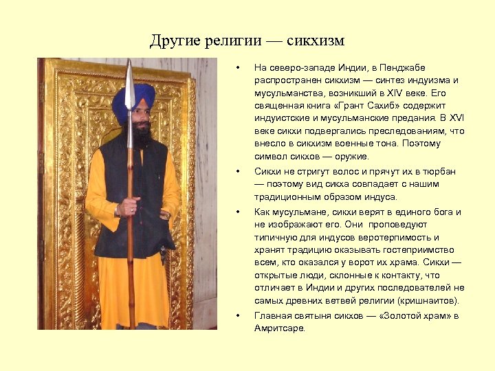 Другие религии — сикхизм • На северо-западе Индии, в Пенджабе распространен сикхизм — синтез индуизма и мусульманства, возникший в XIV веке. Его священная книга «Грант Сахиб» содержит индуистские и мусульманские предания. В XVI веке сикхи подвергались преследованиям, что внесло в сикхизм военные тона. Поэтому символ сикхов — оружие. • Сикхи не стригут волос и прячут их в тюрбан — поэтому вид сикха совпадает с нашим традиционным образом индуса. • Как мусульмане, сикхи верят в единого бога и не изображают его. Они проповедуют типичную для индусов веротерпимость и хранят традицию оказывать гостеприимство всем, кто оказался у ворот их храма. Сикхи — открытые люди, склонные к контакту, что отличает в Индии и других последователей не самых древних ветвей религии (кришнаитов). • Главная святыня сикхов — «Золотой храм» в Амритсаре.