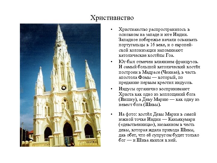 Христианство • • Христианство распространилось в основном на западе и юге Индии. Западное побережье начали осваивать португальцы в 16 веке, и о европейской колонизации напоминают католические костёлы Гоа. Юг был отмечен влиянием французов. И самый большой католический костёл построен в Мадрасе (Ченнае), в честь апостола Фомы — который, по преданию первым крестил индусов. Индусы органично воспринимают Христа как одно из воплощений бога (Вишну), а Деву Марию — как одну из невест бога (Шивы). На фото: костёл Девы Марии в самой южной точке Индии — Каньякумари ( «девственница» ), названном в честь девы, которая ждала прихода Шивы, дав обет, что её супругом будет только бог — и Шива явился к ней.