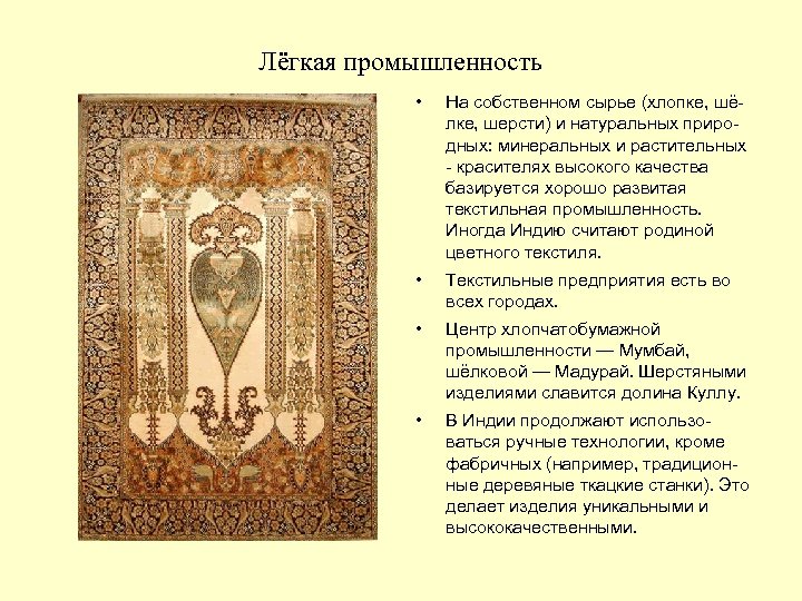 Лёгкая промышленность • На собственном сырье (хлопке, шёлке, шерсти) и натуральных природных: минеральных и растительных - красителях высокого качества базируется хорошо развитая текстильная промышленность. Иногда Индию считают родиной цветного текстиля. • Текстильные предприятия есть во всех городах. • Центр хлопчатобумажной промышленности — Мумбай, шёлковой — Мадурай. Шерстяными изделиями славится долина Куллу. • В Индии продолжают использоваться ручные технологии, кроме фабричных (например, традиционные деревяные ткацкие станки). Это делает изделия уникальными и высококачественными.