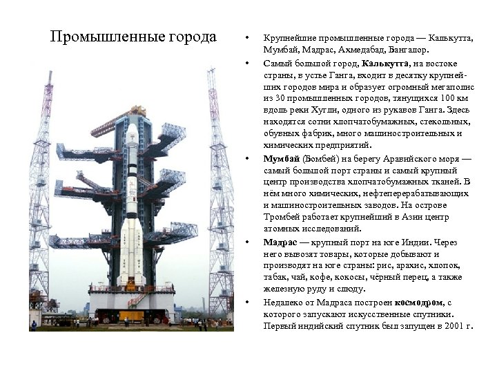 Промышленные города • • • Крупнейшие промышленные города — Калькутта, Мумбай, Мадрас, Ахмедабад, Бангалор. Самый большой город, Калькутта, на востоке страны, в устье Ганга, входит в десятку крупнейших городов мира и образует огромный мегаполис из 30 промышленных городов, тянущихся 100 км вдоль реки Хугли, одного из рукавов Ганга. Здесь находятся сотни хлопчатобумажных, стекольных, обувных фабрик, много машиностроительных и химических предприятий. Мумбай (Бомбей) на берегу Аравийского моря — самый большой порт страны и самый крупный центр производства хлопчатобумажных тканей. В нём много химических, нефтеперерабатывающих и машиностроительных заводов. На острове Тромбей работает крупнейший в Азии центр атомных исследований. Мадрас — крупный порт на юге Индии. Через него вывозят товары, которые добывают и производят на юге страны: рис, арахис, хлопок, табак, чай, кофе, кокосы, чёрный перец, а также железную руду и слюду. Недалеко от Мадраса построен космодром, с которого запускают искусственные спутники. Первый индийский спутник был запущен в 2001 г.