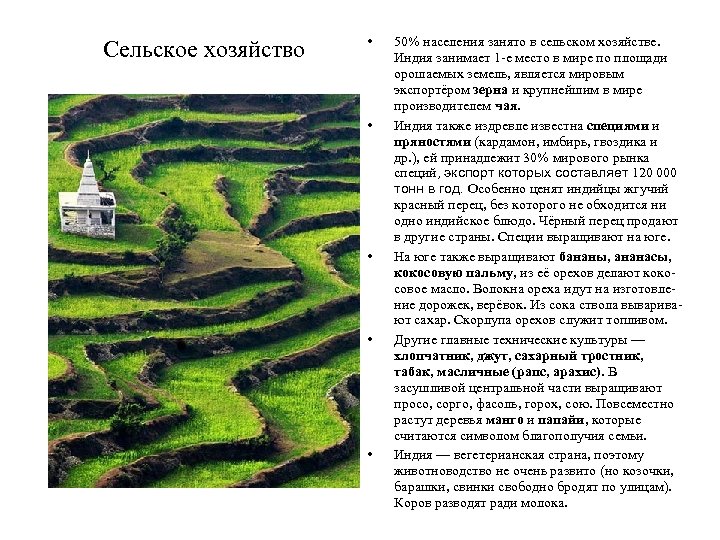Сельское хозяйство • • • 50% населения занято в сельском хозяйстве. Индия занимает 1 -е место в мире по площади орошаемых земель, является мировым экспортёром зерна и крупнейшим в мире производителем чая. Индия также издревле известна специями и пряностями (кардамон, имбирь, гвоздика и др. ), ей принадлежит 30% мирового рынка специй, экспорт которых составляет 120 000 тонн в год. Особенно ценят индийцы жгучий красный перец, без которого не обходится ни одно индийское блюдо. Чёрный перец продают в другие страны. Специи выращивают на юге. На юге также выращивают бананы, ананасы, кокосовую пальму, из её орехов делают кокосовое масло. Волокна ореха идут на изготовление дорожек, верёвок. Из сока ствола вываривают сахар. Скорлупа орехов служит топливом. Другие главные технические культуры — хлопчатник, джут, сахарный тростник, табак, масличные (рапс, арахис). В засушливой центральной части выращивают просо, сорго, фасоль, горох, сою. Повсеместно растут деревья манго и папайи, которые считаются символом благополучия семьи. Индия — вегетерианская страна, поэтому животноводство не очень развито (но козочки, барашки, свинки свободно бродят по улицам). Коров разводят ради молока.