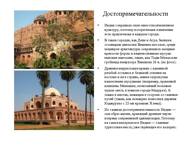 Достопримечательности • Индия сохранила свою многотысячелетнюю культуру, поэтому исторические памятники есть практически в каждом городе. • В таких городах, как Дели и Агра, бывших столицами династии Великих моголов, среди шедевров архитектуры сохранились мощные крепости-форты и величественные мусульманские мавзолеи, такие, как Тадж-Махал или гробница имератора Химаюна 26 в. (на фото). • Древние индуистские храмы с каменной резьбой остались в большей степени на востоке и юге страны, менее затронутых нашествием мусульман (например, храмовый комплекс Минакши, почитаемый восьмым чудом света, в южном городе Мадурае). А также в местах, лежащих в стороне от главных путей (таких, как всемирно известная деревня Каджурахо с 22 -мя храмами X века). • Но главная достопримечательность Индии — сам образ жизни, хранящий древние черты вопреки современной цивилизации. Поэтому не самое интересное в Индии — главные туристские места, уже теряющие его колорит.
