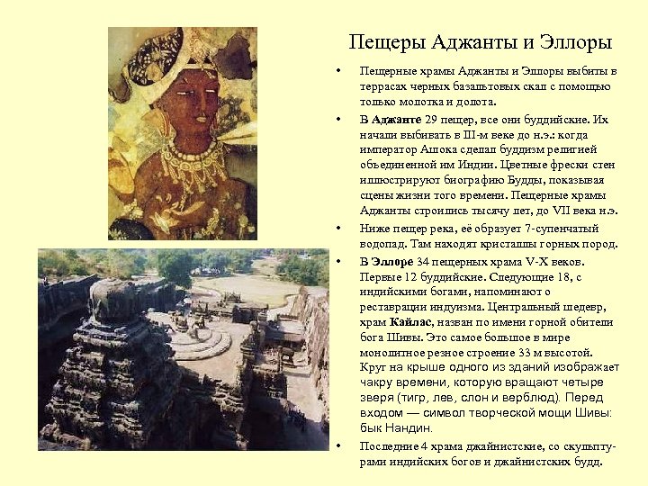 Пещеры Аджанты и Эллоры • • • Пещерные храмы Аджанты и Эллоры выбиты в террасах черных базальтовых скал с помощью только молотка и долота. В Аджанте 29 пещер, все они буддийские. Их начали выбивать в III-м веке до н. э. : когда император Ашока сделал буддизм религией объединенной им Индии. Цветные фрески стен иллюстрируют биографию Будды, показывая сцены жизни того времени. Пещерные храмы Аджанты строились тысячу лет, до VII века н. э. Ниже пещер река, её образует 7 -супенчатый водопад. Там находят кристаллы горных пород. В Эллоре 34 пещерных храма V-X веков. Первые 12 буддийские. Следующие 18, с индийскими богами, напоминают о реставрации индуизма. Центральный шедевр, храм Кайлас, назван по имени горной обители бога Шивы. Это самое большое в мире монолитное резное строение 33 м высотой. Круг на крыше одного из зданий изображает чакру времени, которую вращают четыре зверя (тигр, лев, слон и верблюд). Перед входом — символ творческой мощи Шивы: бык Нандин. Последние 4 храма джайнистские, со скульптурами индийских богов и джайнистских будд.