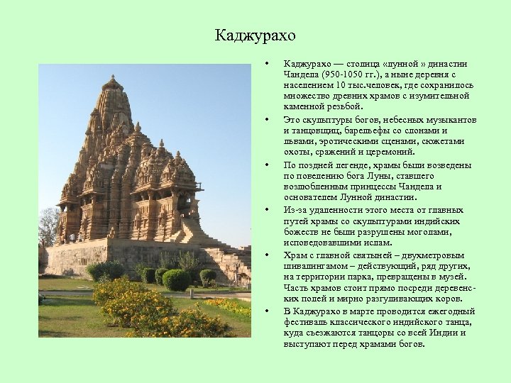 Каджурахо • • • Каджурахо — столица «лунной » династии Чандела (950 -1050 гг. ), а ныне деревня с населением 10 тыс. человек, где сохранилось множество древних храмов с изумительной каменной резьбой. Это скульптуры богов, небесных музыкантов и танцовщиц, барельефы со слонами и львами, эротическими сценами, сюжетами охоты, сражений и церемоний. По поздней легенде, храмы были возведены по повелению бога Луны, ставшего возлюбленным принцессы Чандела и основателем Лунной династии. Из-за удаленности этого места от главных путей храмы со скульптурами индийских божеств не были разрушены моголами, исповедовавшими ислам. Храм с главной святыней – двухметровым шивалингамом – действующий, ряд других, на территории парка, превращены в музей. Часть храмов стоит прямо посреди деревенских полей и мирно разгуливающих коров. В Каджурахо в марте проводится ежегодный фестиваль классического индийского танца, куда съезжаются танцоры со всей Индии и выступают перед храмами богов.