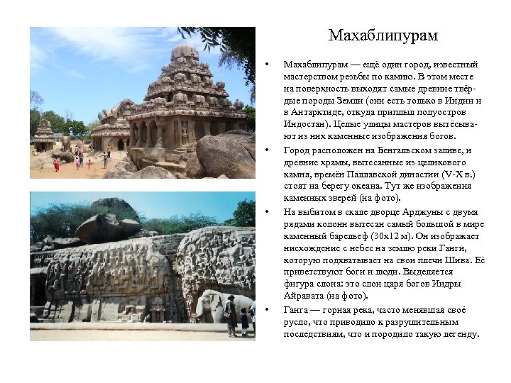 Махаблипурам • • Махаблипурам — ещё один город, известный мастерством резьбы по камню. В этом месте на поверхность выходят самые древние твёрдые породы Земли (они есть только в Индии и в Антарктиде, откуда приплыл полуостров Индостан). Целые улицы мастеров вытёсывают из них каменные изображения богов. Город расположен на Бенгальском заливе, и древние храмы, вытесанные из целикового камня, времён Паллавской династии (V-X в. ) стоят на берегу океана. Тут же изображения каменных зверей (на фото). На выбитом в скале дворце Арджуны с двумя рядами колонн вытесан самый большой в мире каменный барельеф (30 х12 м). Он изображает нисхождение с небес на землю реки Ганги, которую подхватывает на свои плечи Шива. Её приветствуют боги и люди. Выделяется фигура слона: это слон царя богов Индры Айравата (на фото). Ганга — горная река, часто менявшая своё русло, что приводило к разрушительным последствиям, что и породило такую легенду.