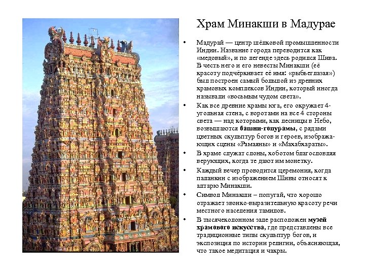 Храм Минакши в Мадурае • • • Мадурай — центр шёлковой промышленности Индии. Название города переводится как «медовый» , и по легенде здесь родился Шива. В честь него и его невесты Минакши (её красоту подчёркивает её имя: «рыбьеглазая» ) был построен самый большой из древних храмовых комплексов Индии, который иногда называли «восьмым чудом света» . Как все древние храмы юга, его окружает 4 угольная стена, с воротами на все 4 стороны света — над которыми, как лесницы в Небо, возвышаются башни-гопурамы, с рядами цветных скульптур богов и героев, изображающих сцены «Рамаяны» и «Махабхараты» . В храме служат слоны, хоботом благословляя верующих, когда те дают им монетку. Каждый вечер проводится церемония, когда паланкин с изображением Шивы относят к алтарю Минакши. Символ Минакши – попугай, что хорошо отражает звонко-выразительную красоту речи местного населения тамилов. В тысячеколонном зале расположен музей храмового искусства, где представлены все традиционные типы скульптур богов, и экспозиция по истории религии, объясняющая, что такое медитация и чакры.