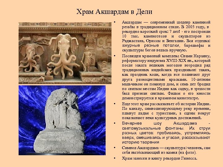 Храм Акшардам в Дели • • • Акшардам — современный шедевр каменной резьбы в традиционном стиле. В 2005 году, в рекордно короткий срок: 7 лет! - его построили 10 тыс. каменотесов и скульпторов из Раджастана, Ориссы и Бенгалии. Вся отделка: ажурные резные потолки, барельефы и скульптуры богов велась вручную. Посвящен храмовый комплекс Свами Нараяну, реформатору индуизма XVIII-XIX вв. , который после заката великих моголов возродил ряд традиционных индийских праздников: таких, как праздник холи, когда все поливают друга разноцветными красками. 10 -летним мальчиком он покинул дом, и семь лет бродил по святым местам Индии как садху, в зрелости был признан святым. Фильм о его юности демонстрируется в храмовом кинотеатре. Еще этот храм рассказывает об истории Индии. По каналу, символизирующему реку времени, плывут ладьи с туристами, а сцены вокруг показывают вехи культурных достижений. Вечернее шоу Акшардама - светомузыкальные фонтаны. Их струи разных цветов: пробиваясь, устремляясь вверх, смешиваясь и угасая, рассказывают историю творения Символ Акшардама — скульптура: человек, сам себя вытёсывающий из камня (на фото). Храм занесен в книгу рекордов Гинесса.
